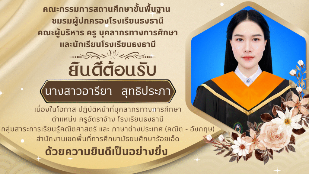 โรงเรียนธงธานี ยินดีต้อนรับ นางสาวอารียา สุทธิประภา เนื่องในโอกาสมาปฏิบัติหน้าที่ตำแหน่งครูอัตราจ้าง สอนในรายวิชาคณิตศาสตร์-ภาษาอังกฤษ Share this: Click to share on Facebook (Opens in new window) Facebook Click to share on X (Opens in new window) X